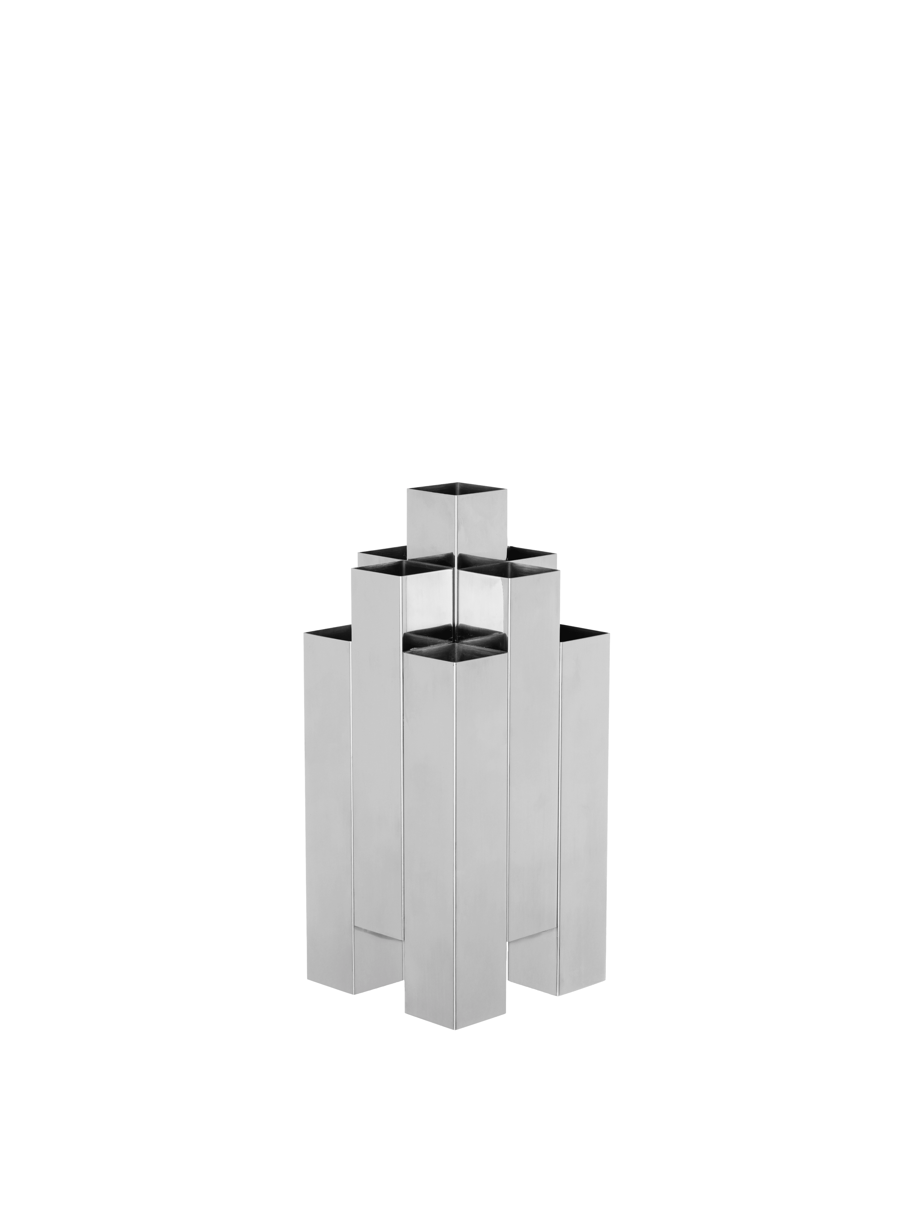 Tessera-vasen ger hemmet skulptural karaktär med sin slående arkitektoniska form. Tillverkad av spegelpolerat rostfritt stål fångar och reflekterar den ljus, vilket ger en dynamisk närvaro till en hylla, matbord eller skänk. Vasen är utformad för att hålla blomsterarrangemang eller stå ensam som ett objekt i sig självt, och erbjuder en genomtänkt balans mellan form och funktion.