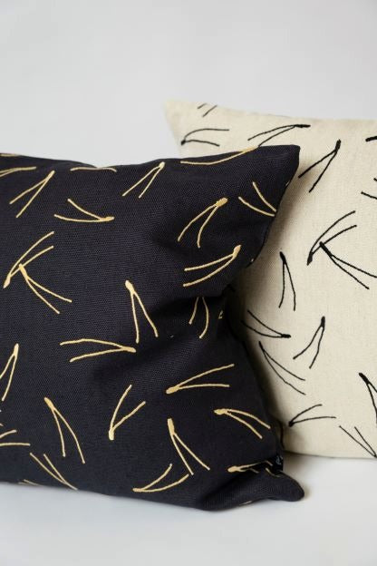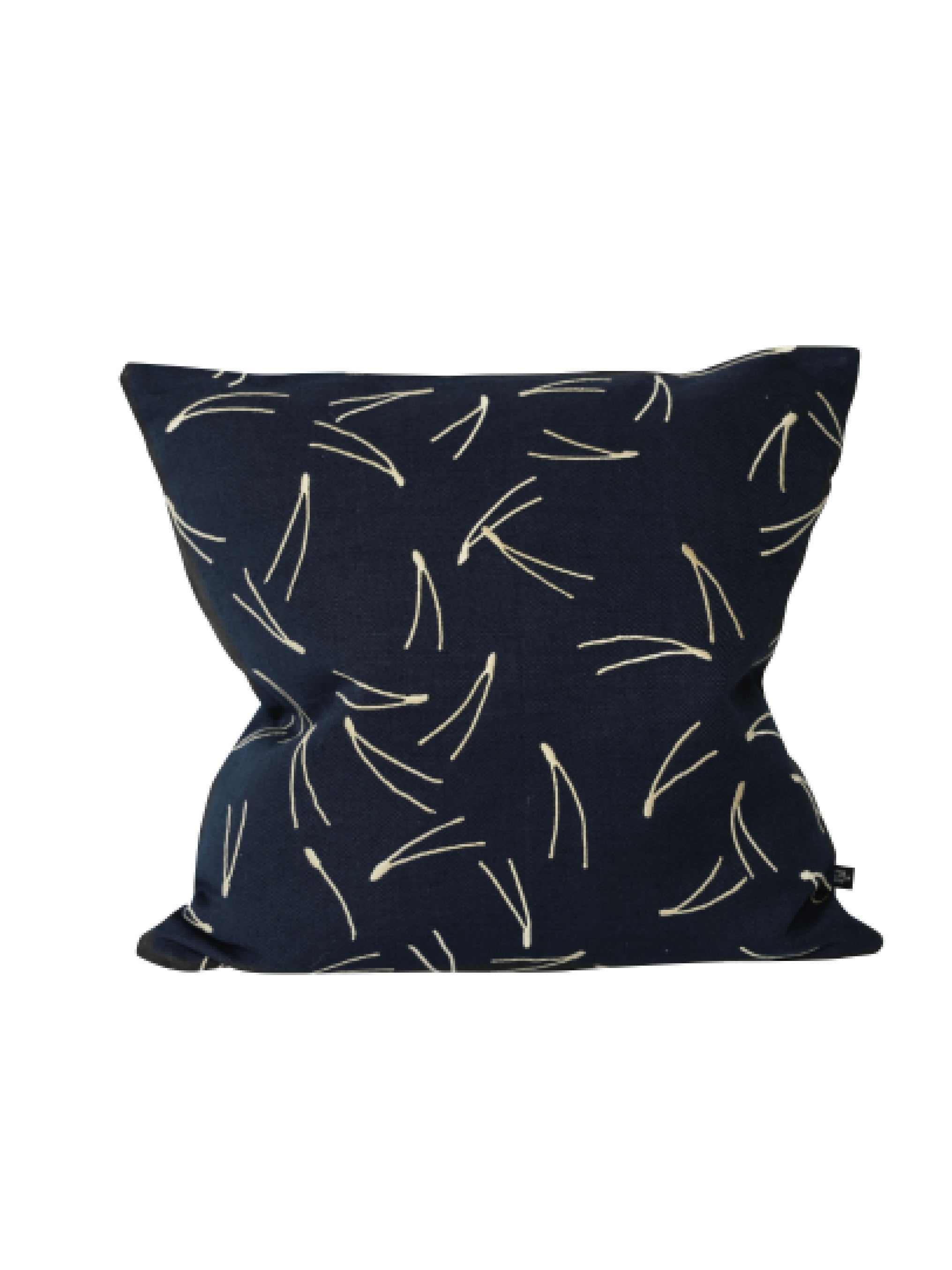Broderat kuddfodral med mönstret Barr på en härligt mjuk och tjock linnekvalitet. Antracitblå botten med guldfärgat broderi.