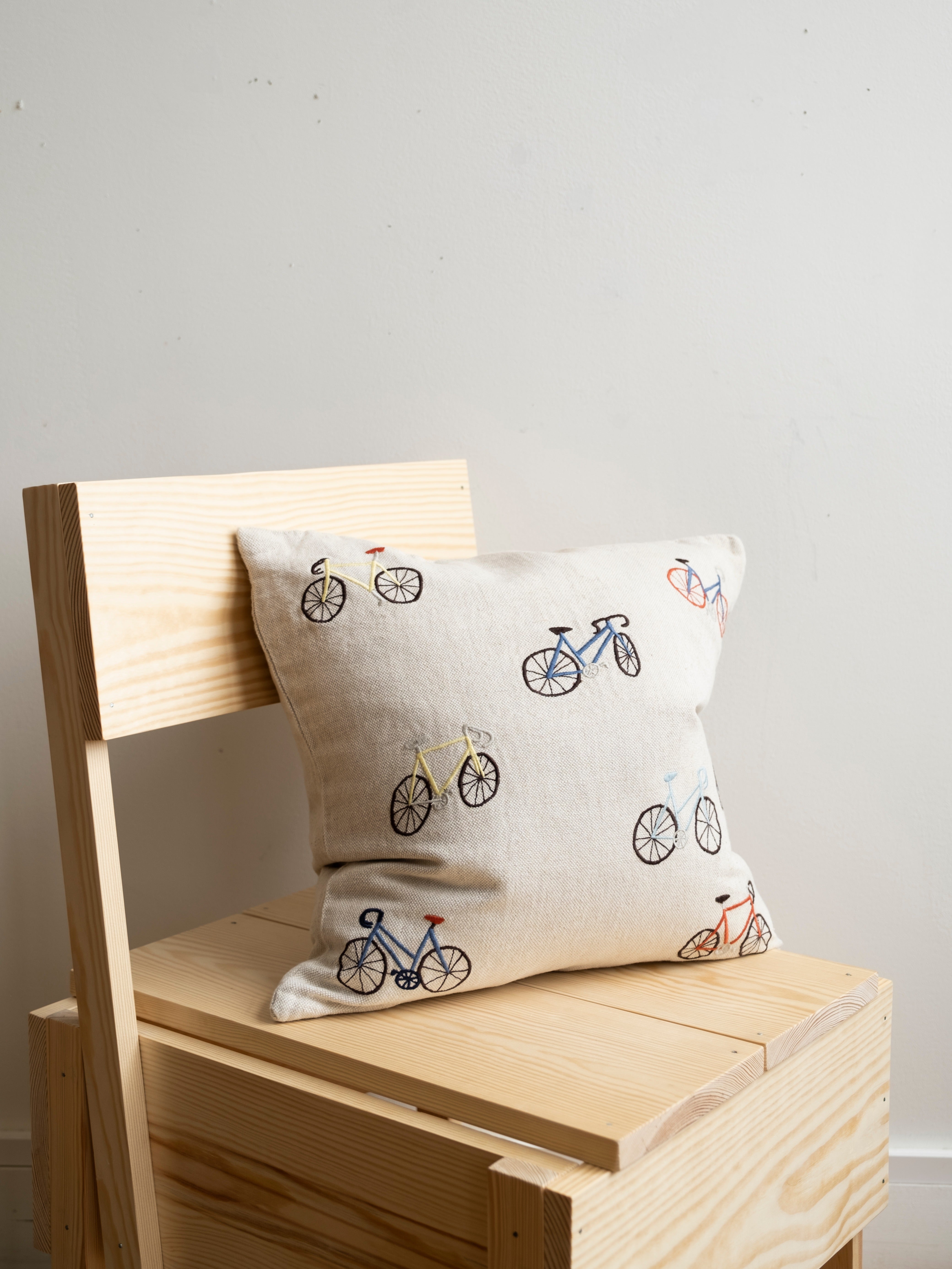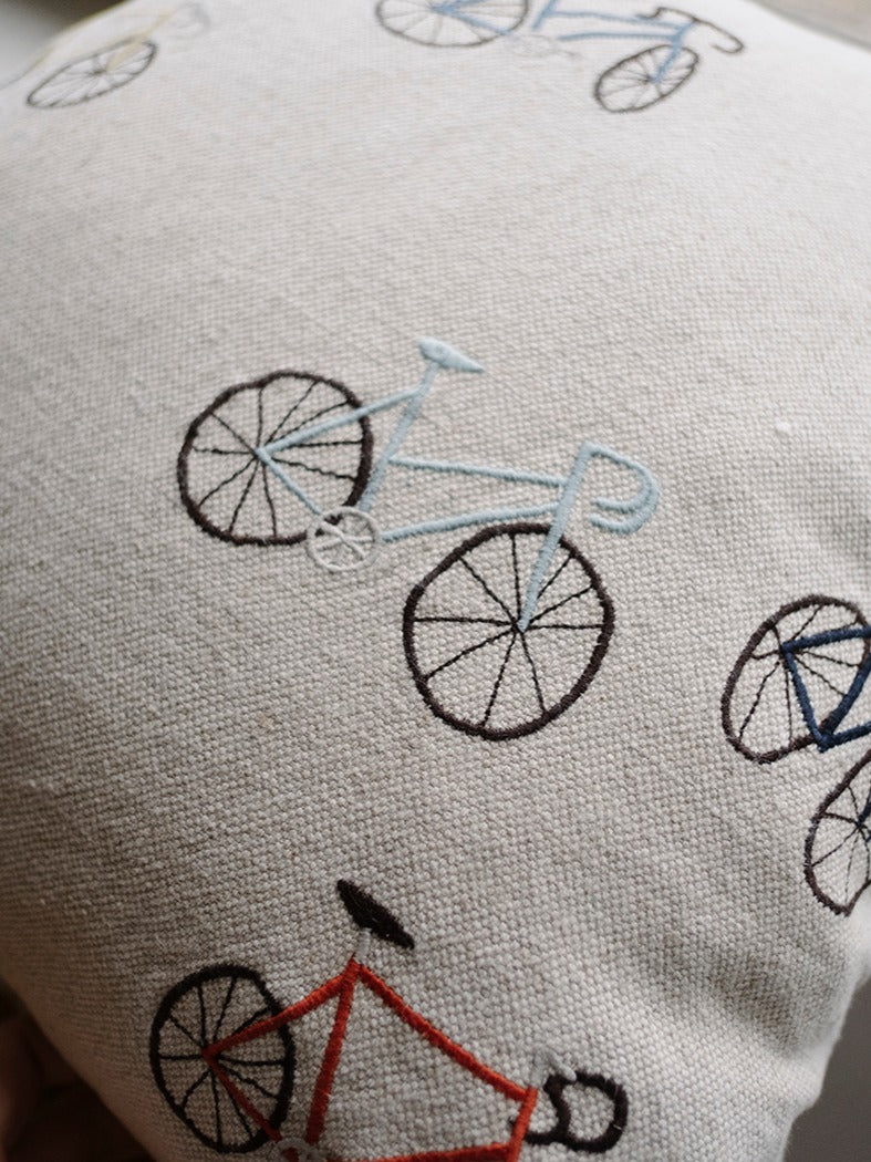 Kuddfodral i mjuk kraftig oblekt linnekanvas med broderat motiv av cyklar i olika färger. Kuddfodralet är designat av Elisabeth Dunker och passar lika bra i soffan som på sängen, eller varför inte i barnrummet?