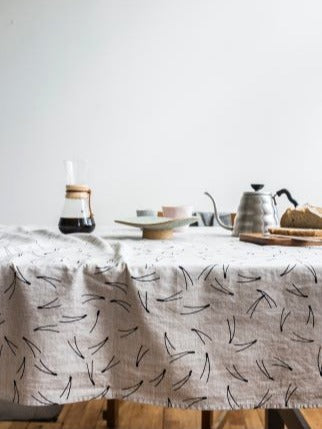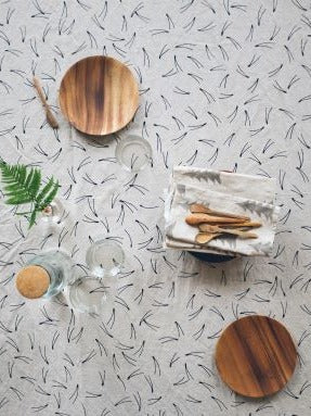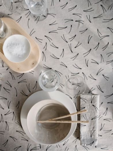 Fine Little Day's klassiska mönster Barr på en duk i underbar tvättad oblekt linnekvalitet. Mixa och matcha med servetter i samma eller annat mönster för vackra dukningar. En stor del av Fine Little Days mönstervärld är inspirerad av uttryck från den svenska naturen. Mönstret Barr trycktes på textil första gången 2013.