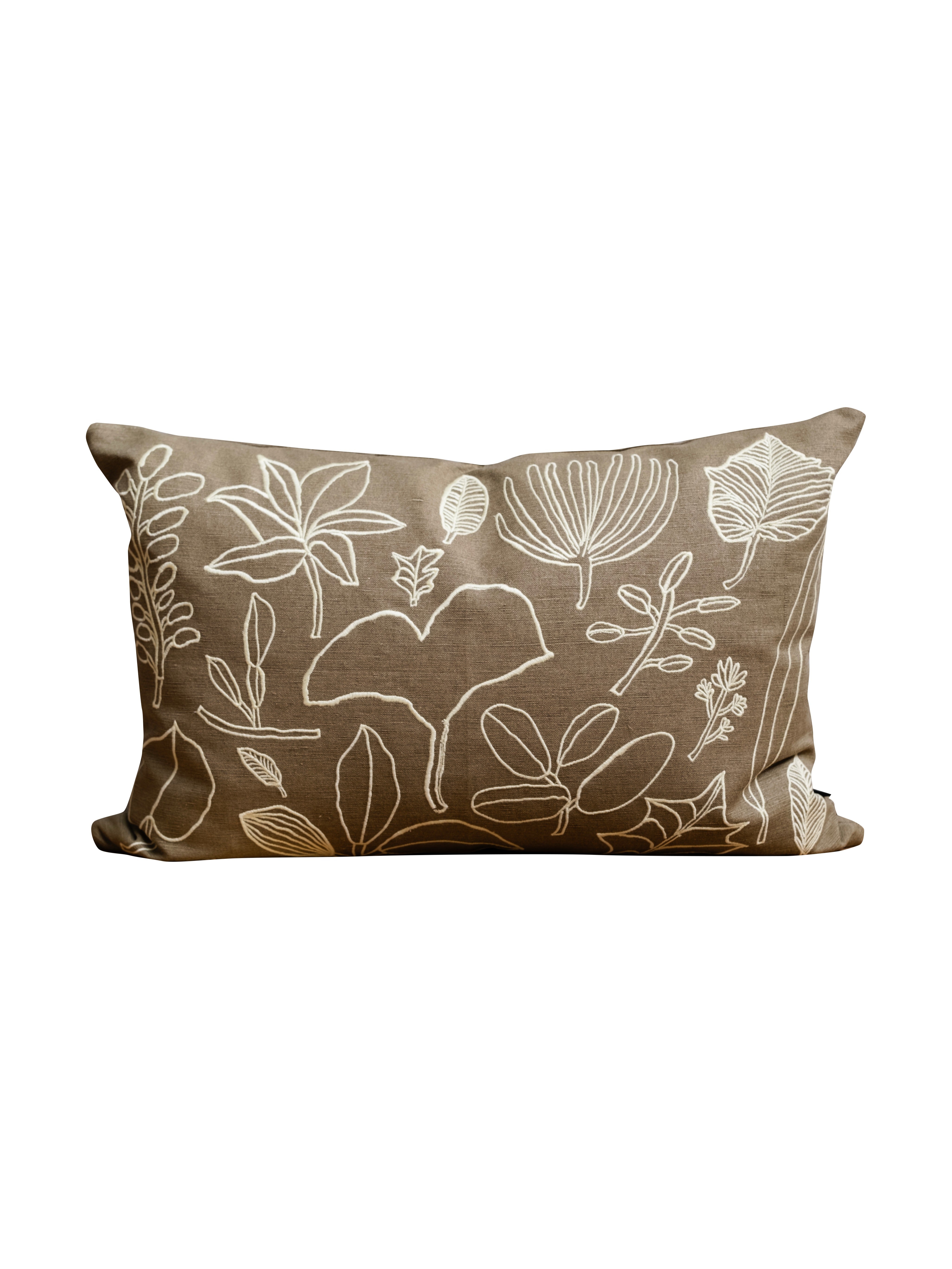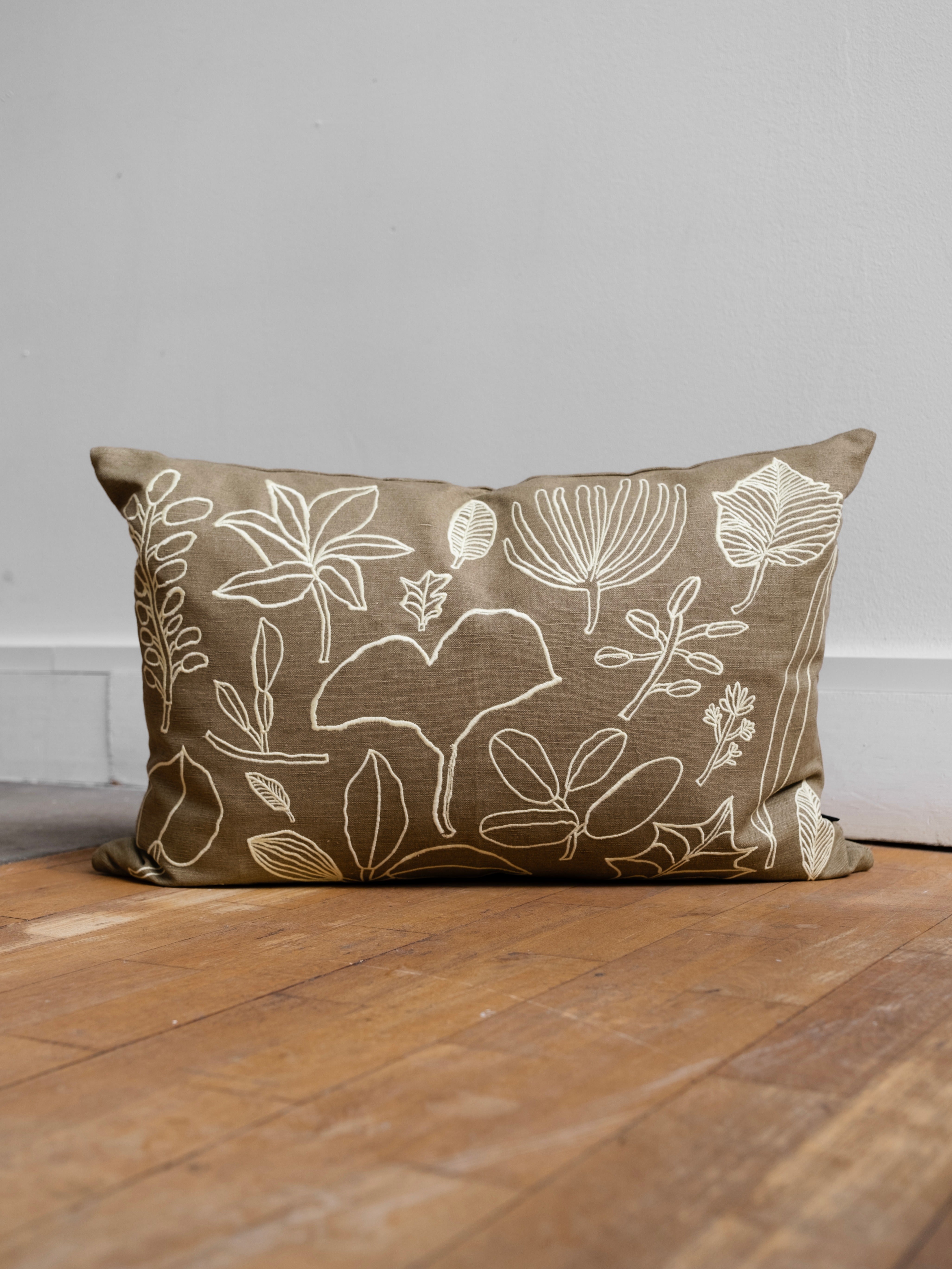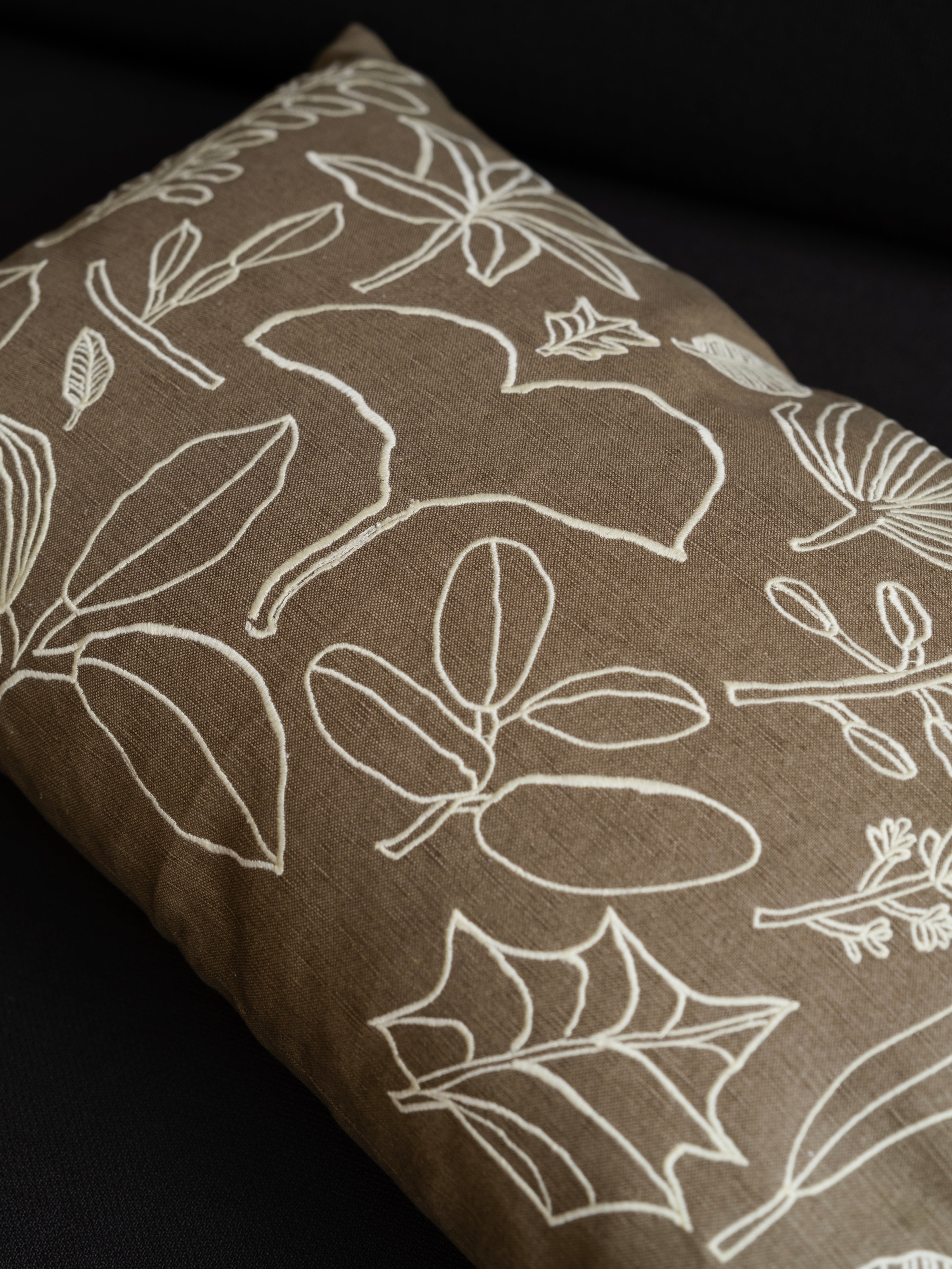 Ett kuddfodral med broderat botaniskt mönster av vår bästa vän Mogu Takahashi. En riktig statementkudde för soffan!
