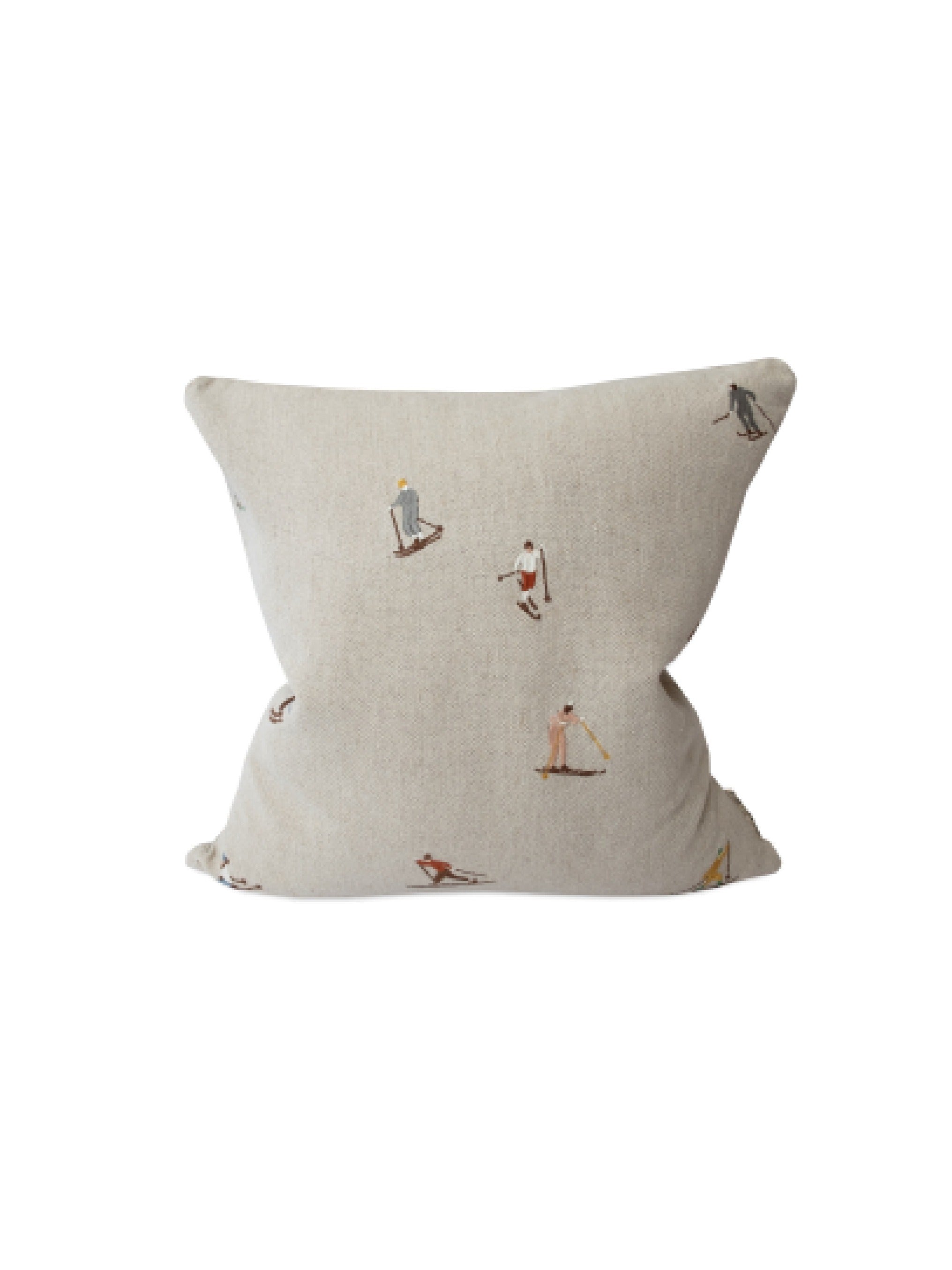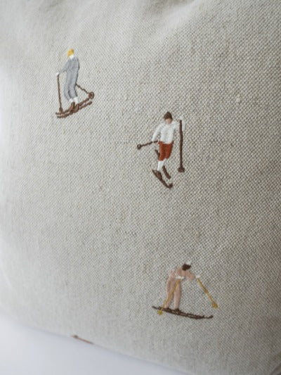 Kuddfodral i mjuk kraftig oblekt linnekanvas med broderade skidåkare. Vintersport, inte bara bra för kroppen utan även vacker för ögat. Kuddfodral som passar lika fint hemma i soffan som i fjällstugan.