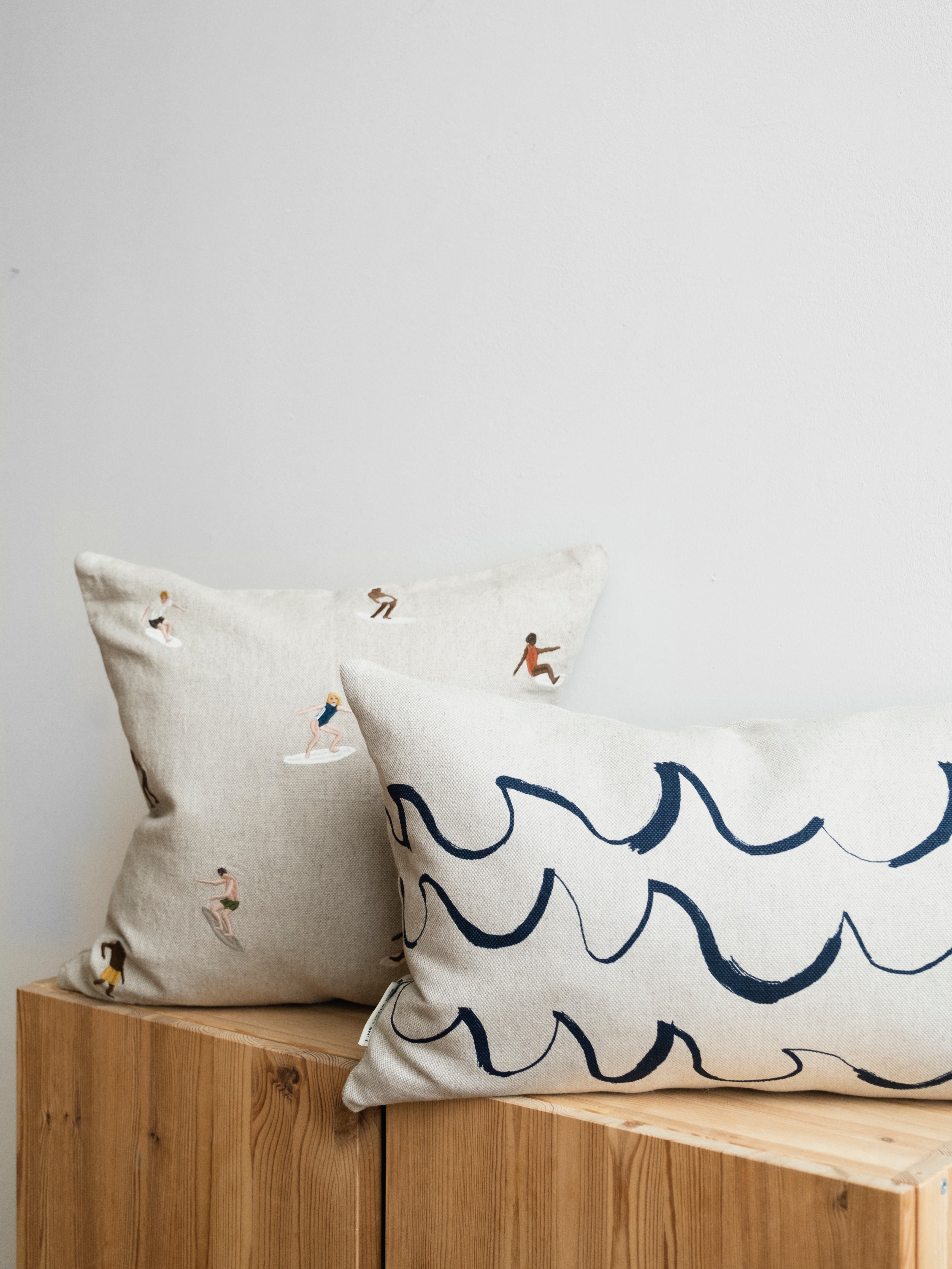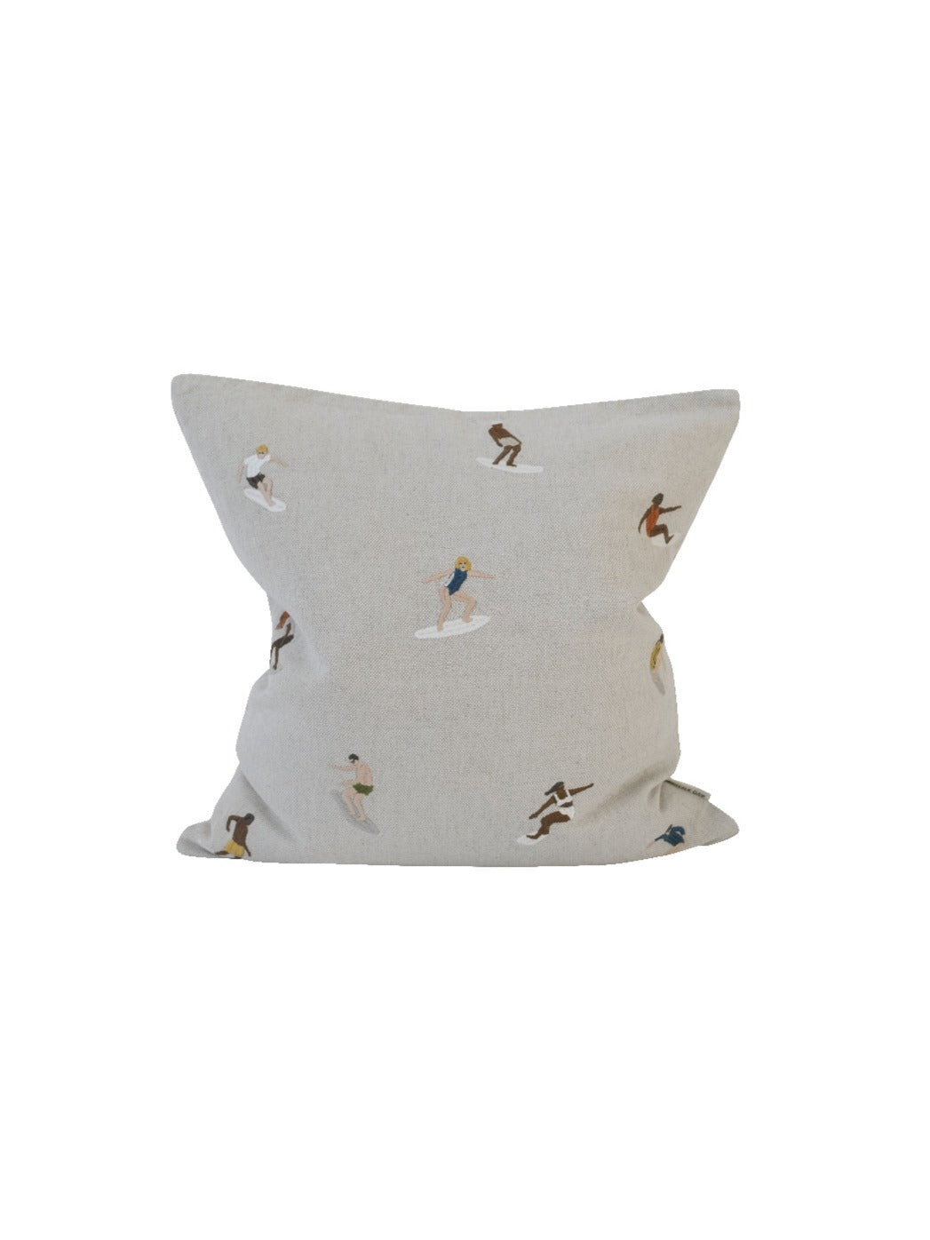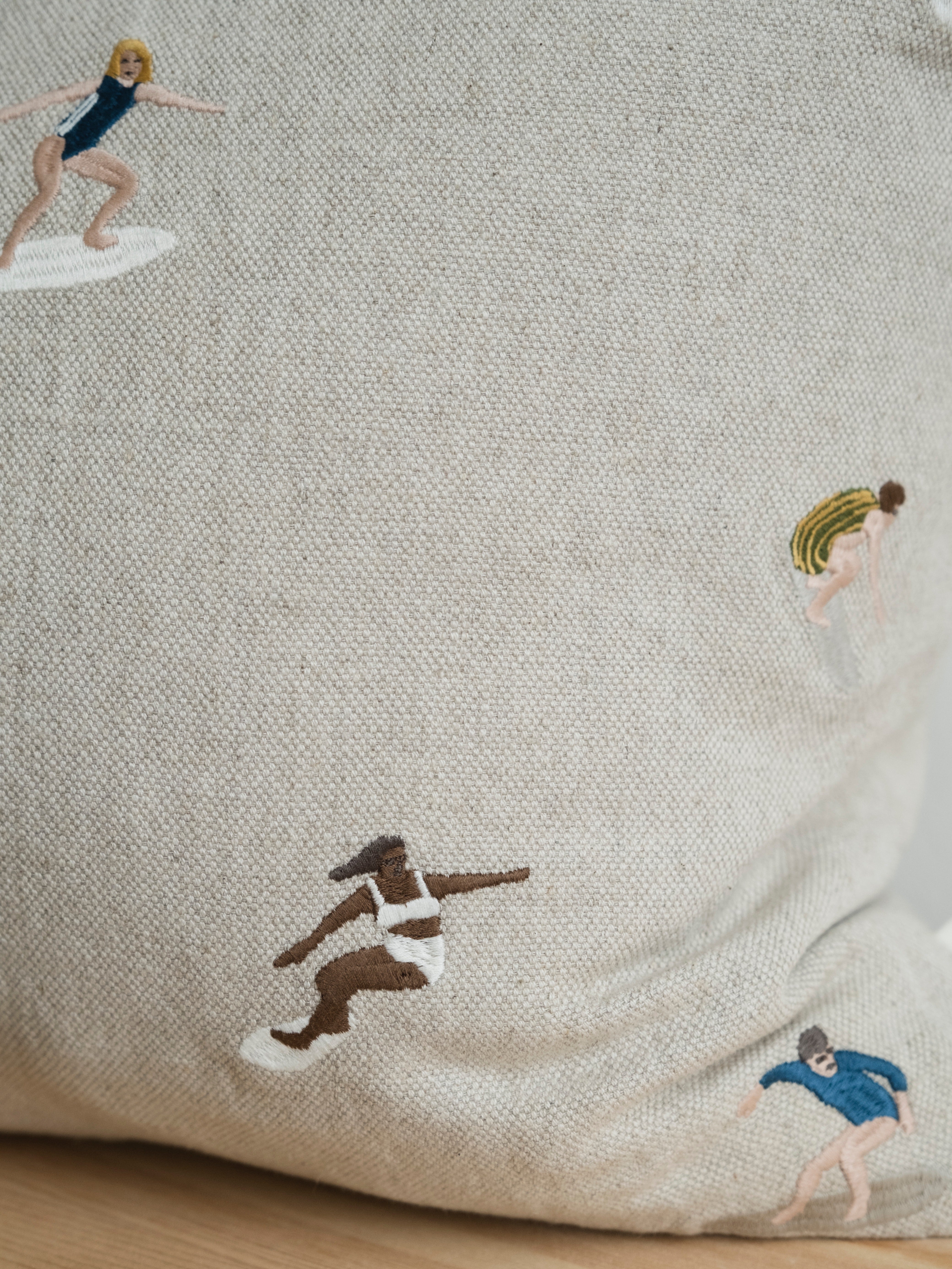 Möt vågorna och känn havets kraft och energi. Kuddfodral i mjuk kraftig oblekt linnekanvas med broderade surfare efter originalteckning av Elisabeth Dunker.