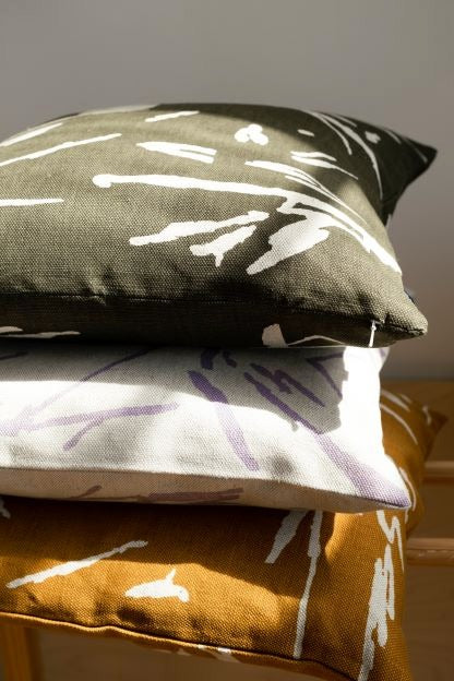 Kuddfodral i tjock linnekvalitet med ett expressivt och explosivt mönster av Unni Toivola. Toivolas konstnärskap har sin grund i måleriet, men har även förgrenat sig till textil och skulptur. Hennes arbetssätt beskrivs bäst som processbaserat, där processen och utforskandet tar henne framåt och gärna får synas i slutresultatet.