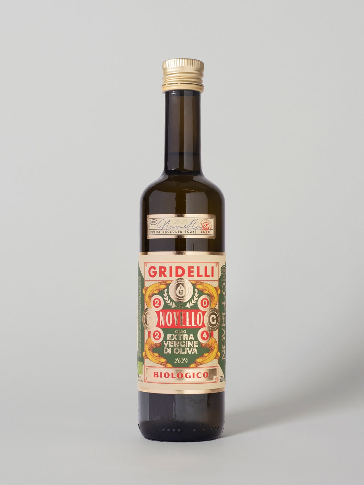 Ekologisk och extra virgin olivolja av högsta kvalitet. Oljan görs på olivtypen Correggiolo som växer på kullarna utanför Rimini i det bördiga Emilia-Romagna. Novello är namnet på den första pressningen från årets skörd och oliverna plockas för hand dagen de skiftar från grönt till violett, för att sedan pressas på samma gård inom 24 timmar. Då oliverna är precis på gränsen till mogna när de plockas går det medvetet åt fler än vid senare pressningar. Det är detta som ger Novellon dess distinkta smak och man kan känna toner av gräs, samt kronärtskocka med en pepprig eftersmak. Novellon använder man med fördel ”rå”.