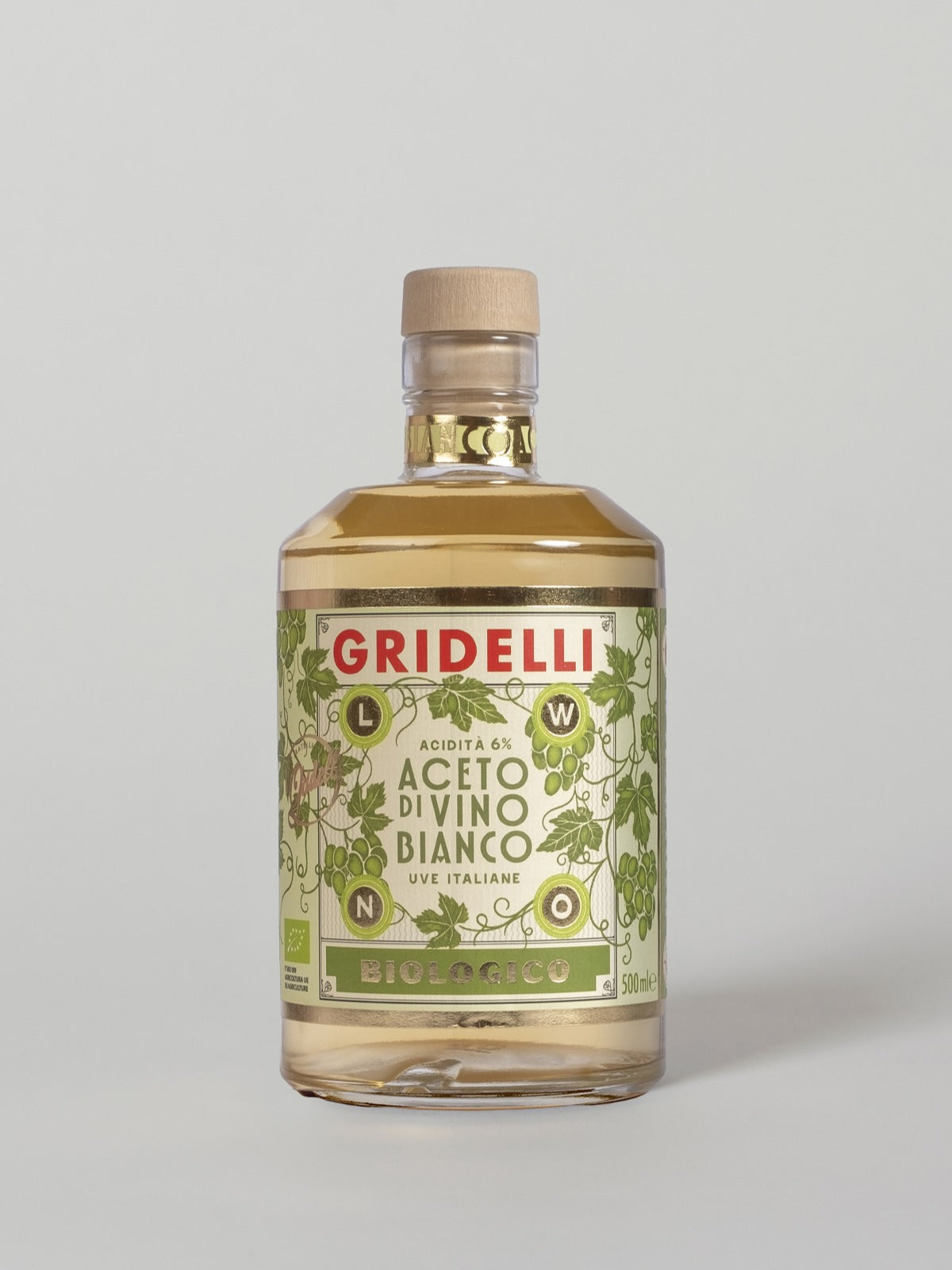 En vitvinsvinäger från Gridelli, gjord på italienska ekologiska druvor av sorten Trebbiano och producerad i den italienska regionen Emilia-Romagna. Den innehåller inga andra ingredienser. Vinägern har en hög syra, och passar därmed utmärkt för att blanda en vinägrett och ringla över både tomat- eller grönsallad.