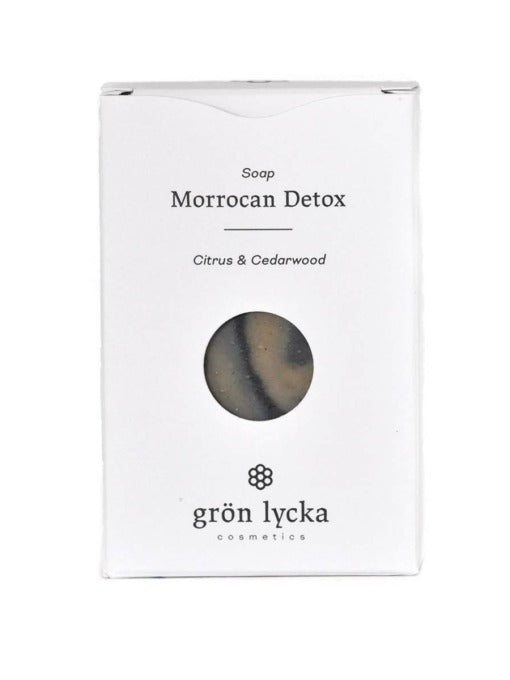 Handgjord ekologisk tvål med mjuk och behaglig doft av eteriska oljor från cederträ och citrusdoftande litsea cubeba. Kallpressad ekologisk arganolja är juvelen i Morrocan Detox tillsammans med kokosmjölk, havre och kakaosmör.