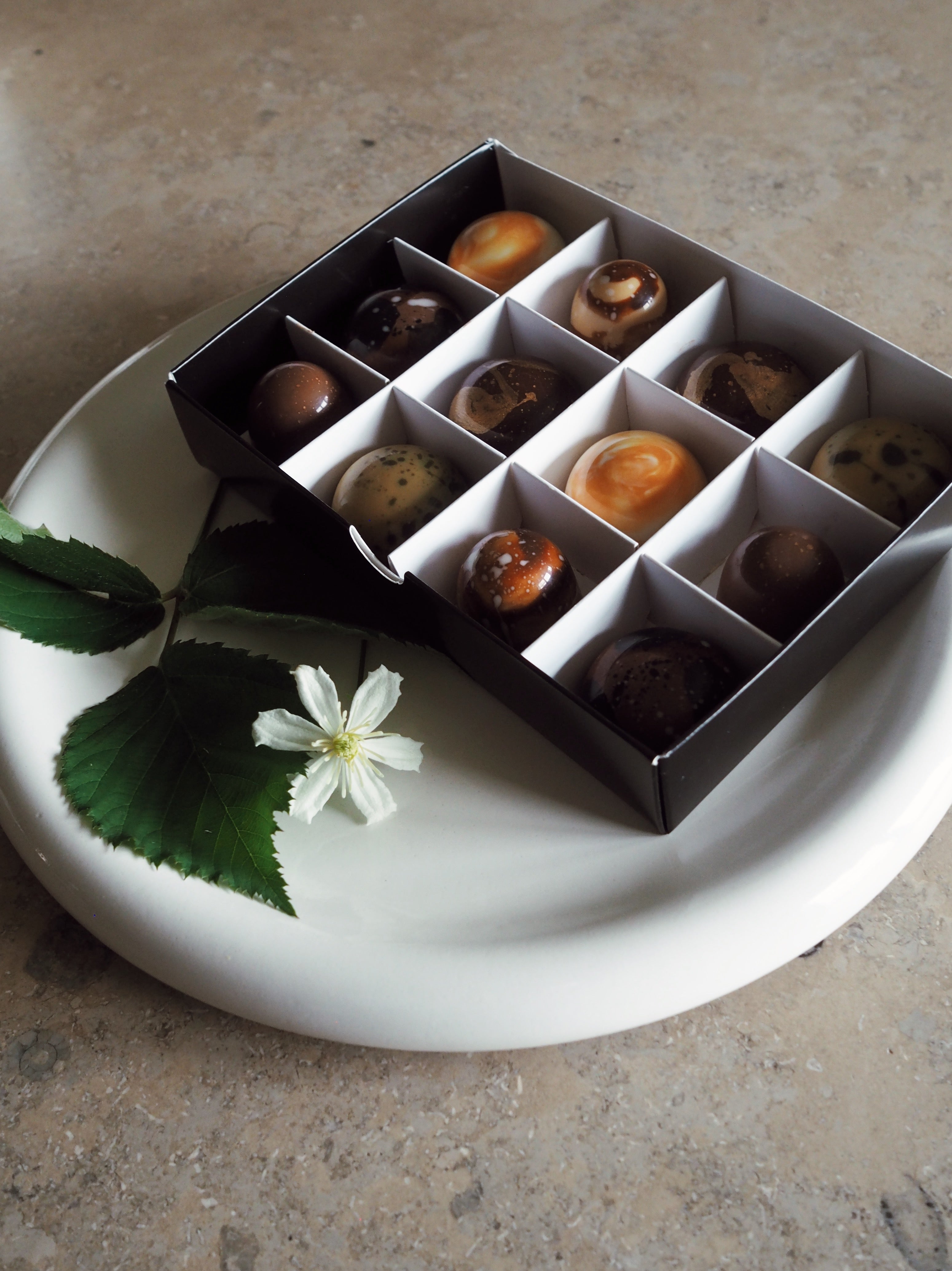 12 stycken handgjorda praliner från Lilla Wester, i en presentask (2 av varje sort).
