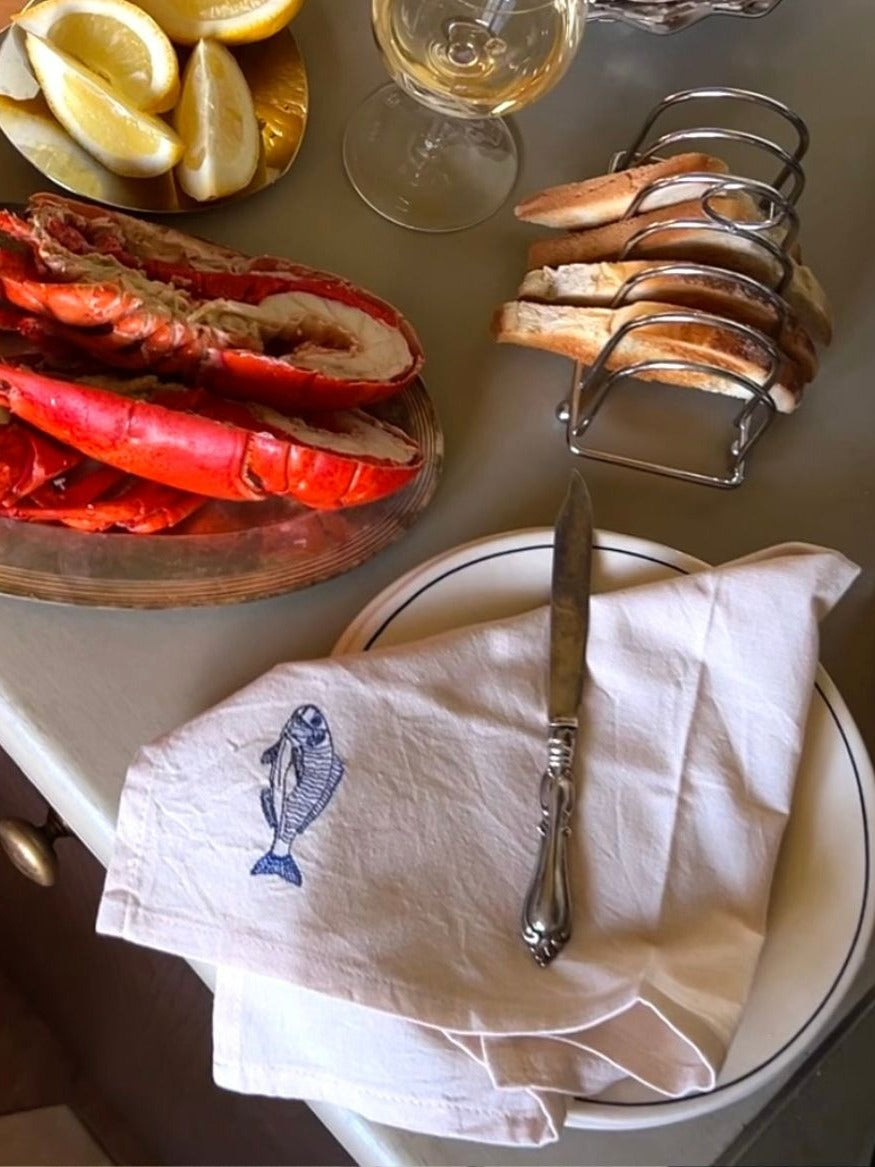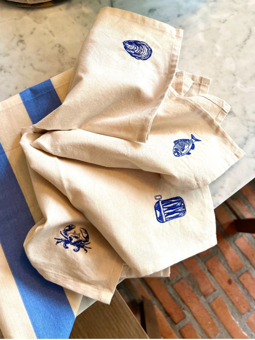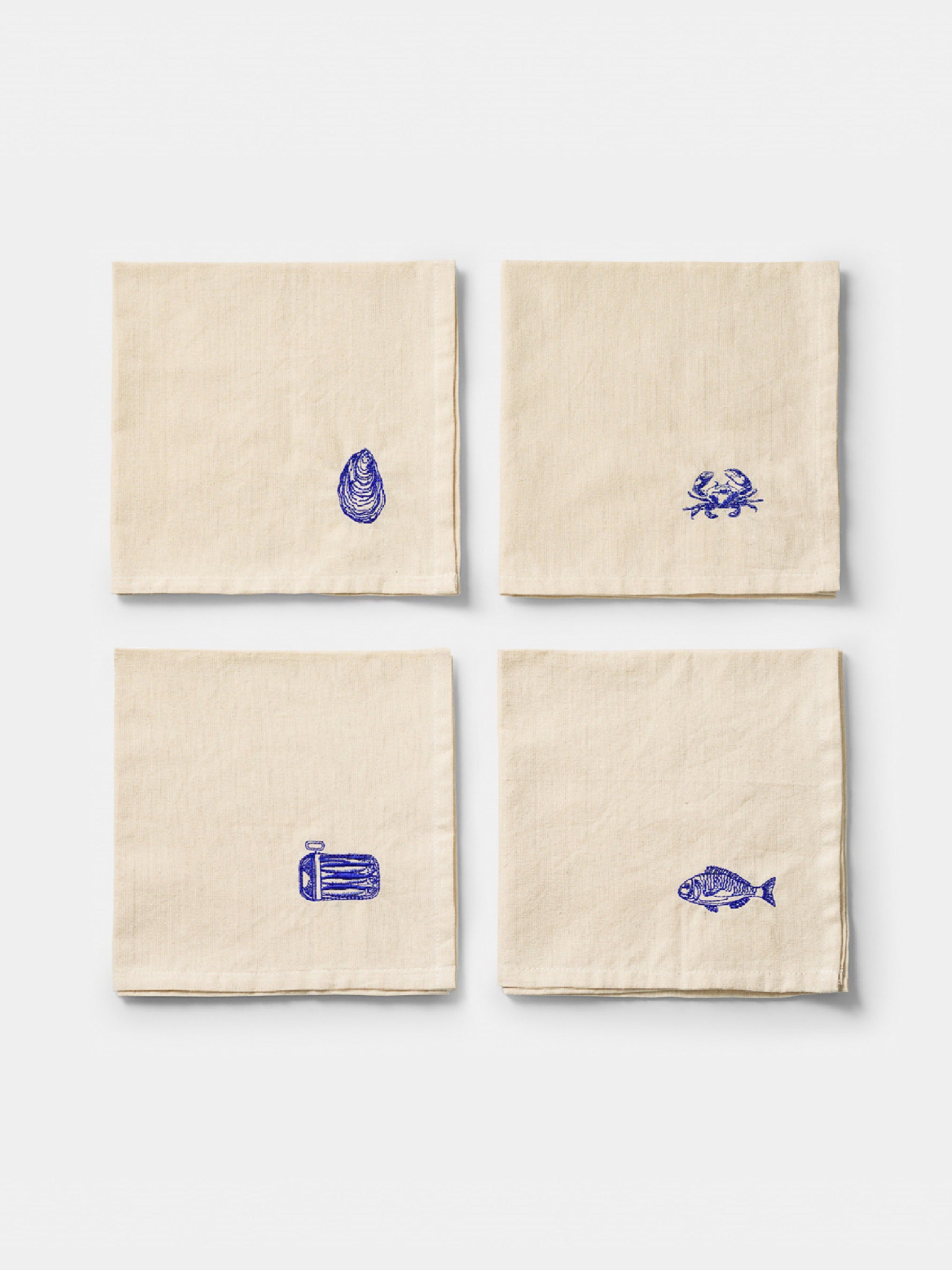 Dessa servetter säljs i set om fyra. De har fyra individuella havsinspirerade broderier i koboltblått på Midnatts klassiska beige bas. Broderierna inkluderar ett ostron, en krabba, en fisk och en burk med sardiner. Servetterna är 40×40 cm.