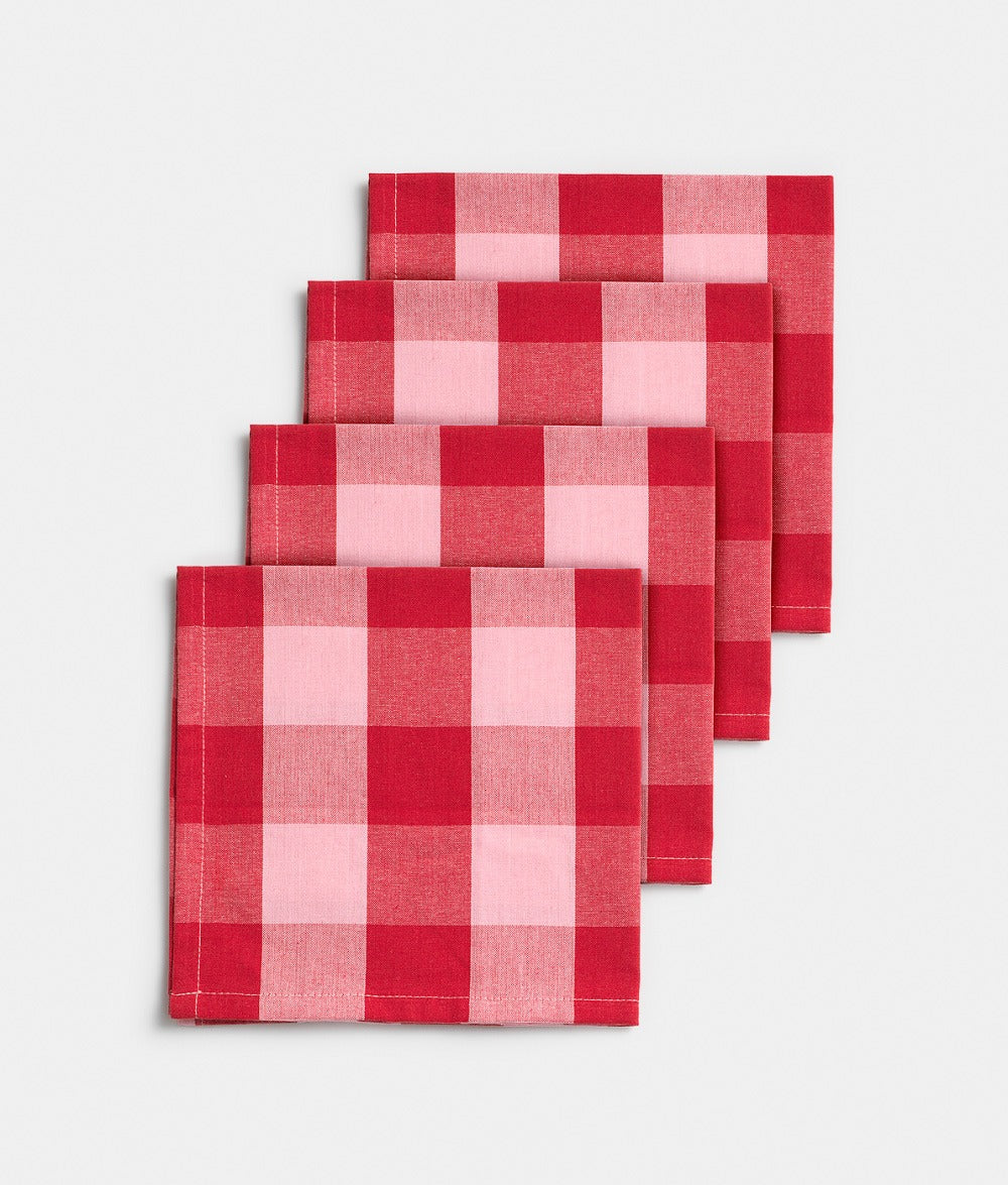 Rosa-rödrutig servetter i set om fyra. Servetterna är 40×40 cm.