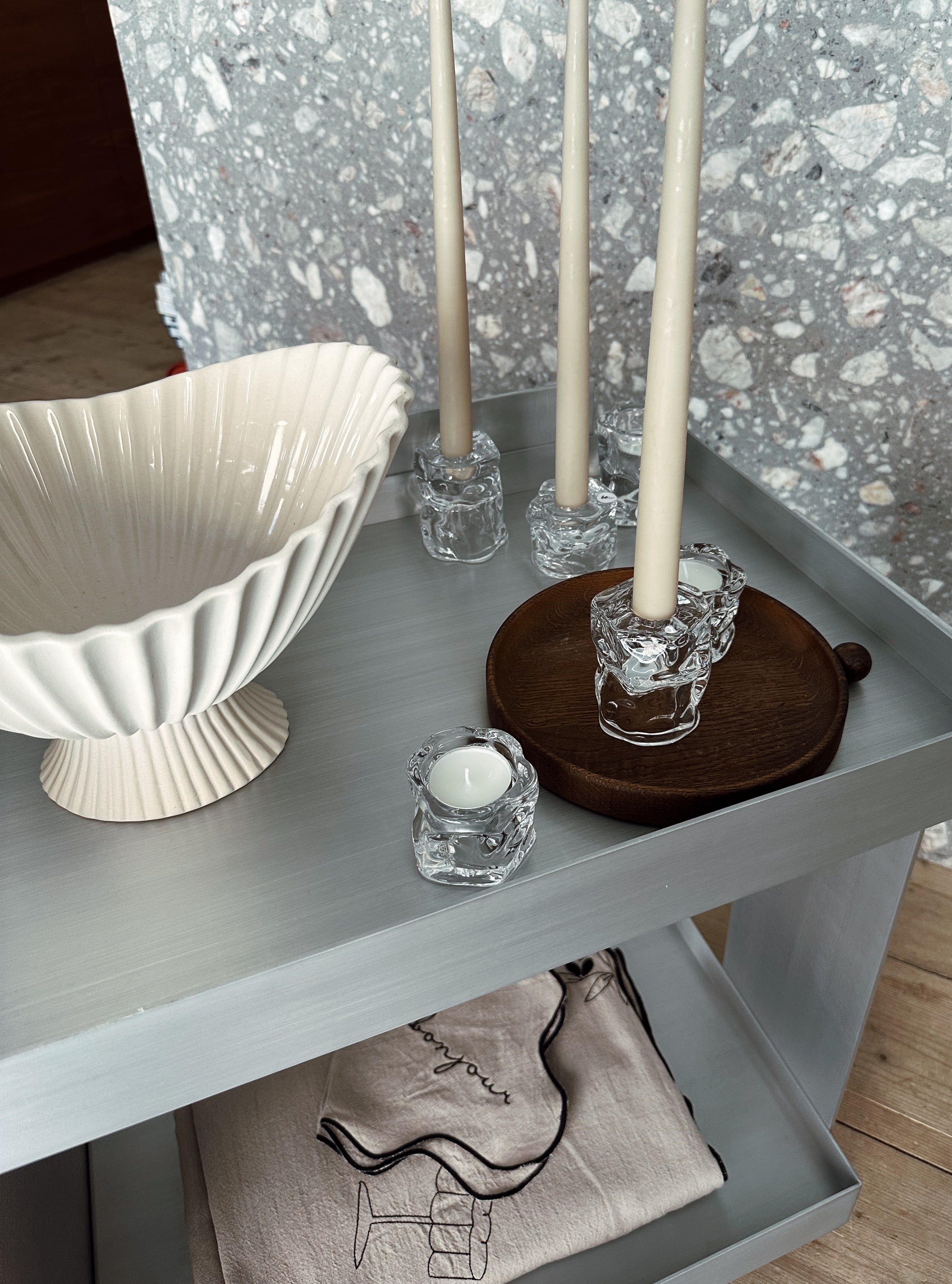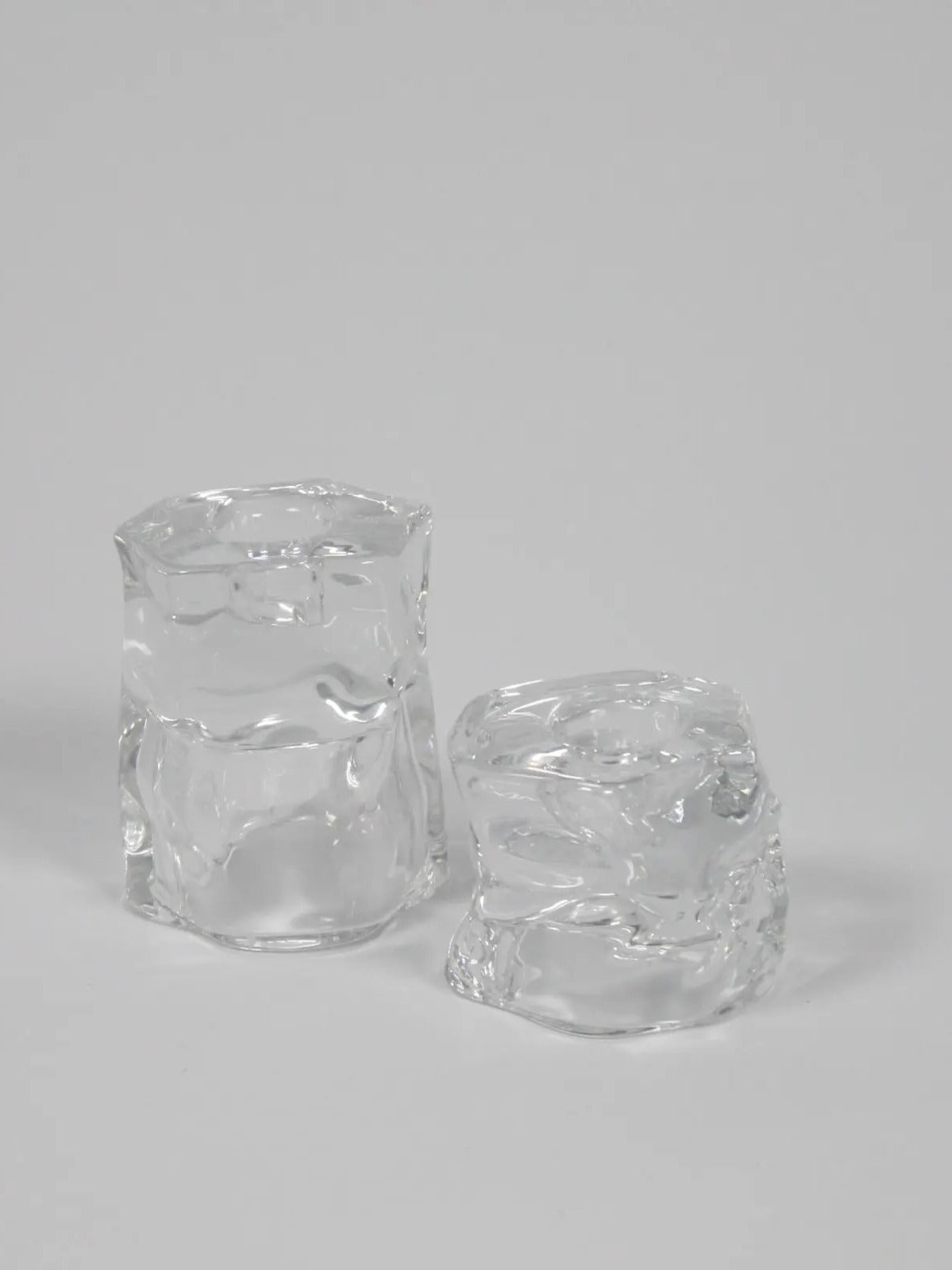 Vändbar ljusstake i glas som fungerar för både värmeljus och kronljus. Unik, oregelbunden form.