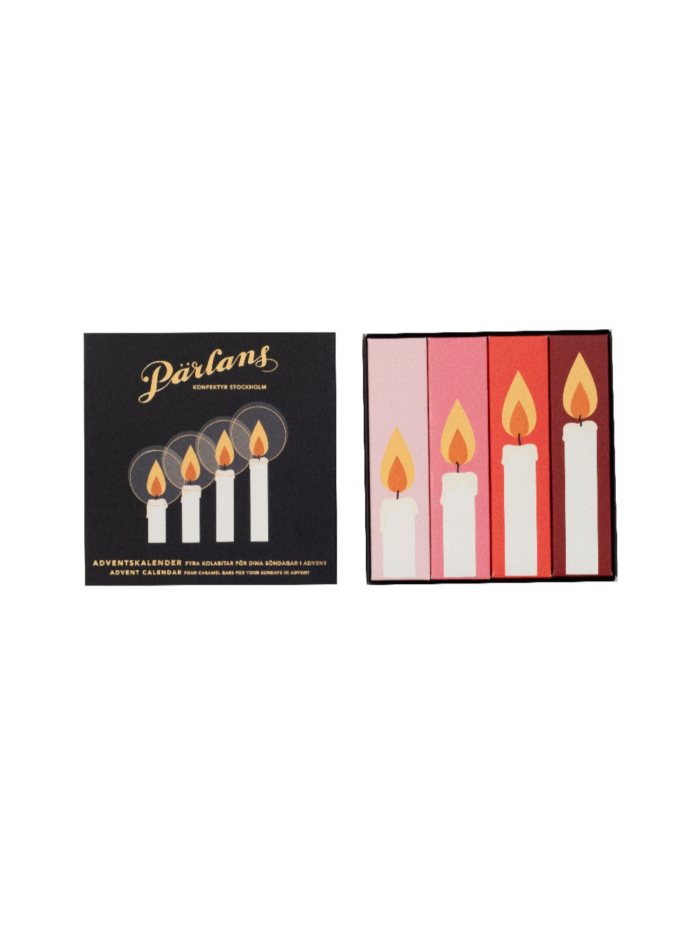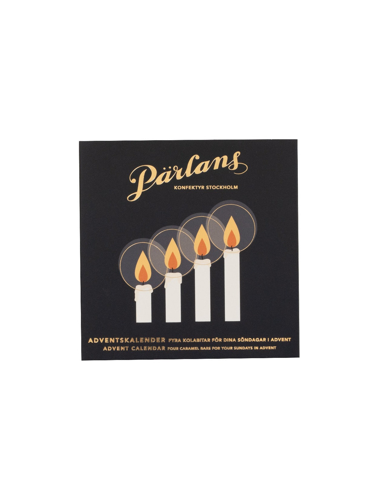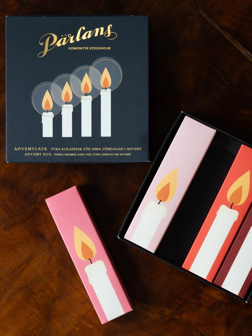 En adventskalender med fyra luckor - varje söndag bjuder på en kolabit stor nog att dela, eller behålla alldeles för sig själv, i säsongens godaste smaker av kola och ett fint lager mörk eller ljus ekologisk choklad. Fyra smakfulla ljus att lysa upp decembermörkret med.