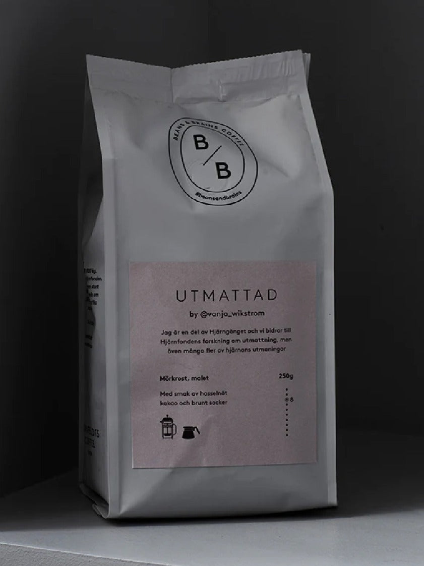 Utmattad: Mörkrost, malen. Med smak av hasselnöt, kakao och brunt socker. Kaffet innehåller inte spår av nötter.