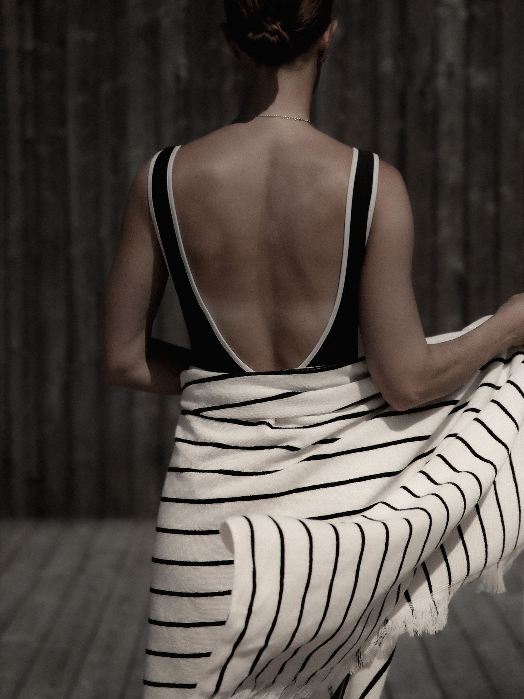 Juno badlakan i ekologisk bomull är vävt med klassisk frotté-teknik, vilket ger en mjuk känsla och utmärkt absorptionsförmåga. Den stiliga randiga designen i svart och vitt ger en tidlös och elegant touch till ditt badrum. Med sina generösa mått på 100x180 cm fungerar det lika bra att svepa in sig i efter duschen som att ligga och sola, då den rymliga ytan ger både komfort och funktion.