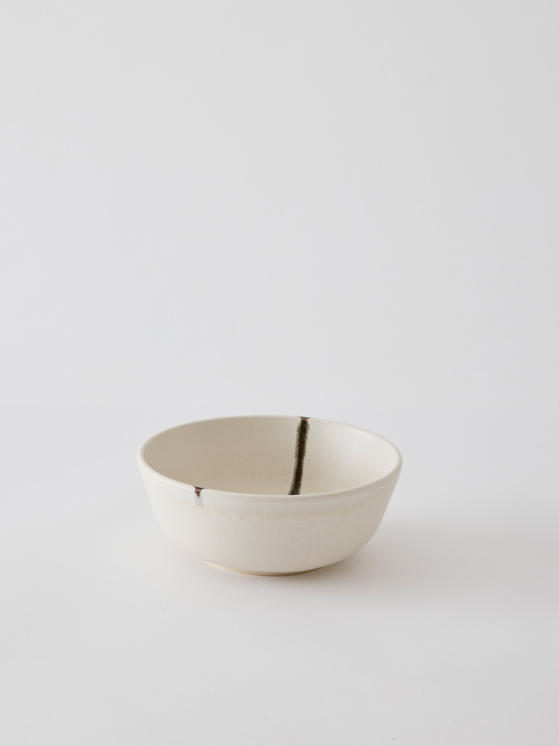 Handgjord serveringsskål från Toledo-serien i vit färg med en grön/svart inbränd linje som ger ett fint mönster i stengodset. Skålen är perfekt för att servera såser, snacks eller andra tillbehör. I Toledo-serien finns också en lite större skål.